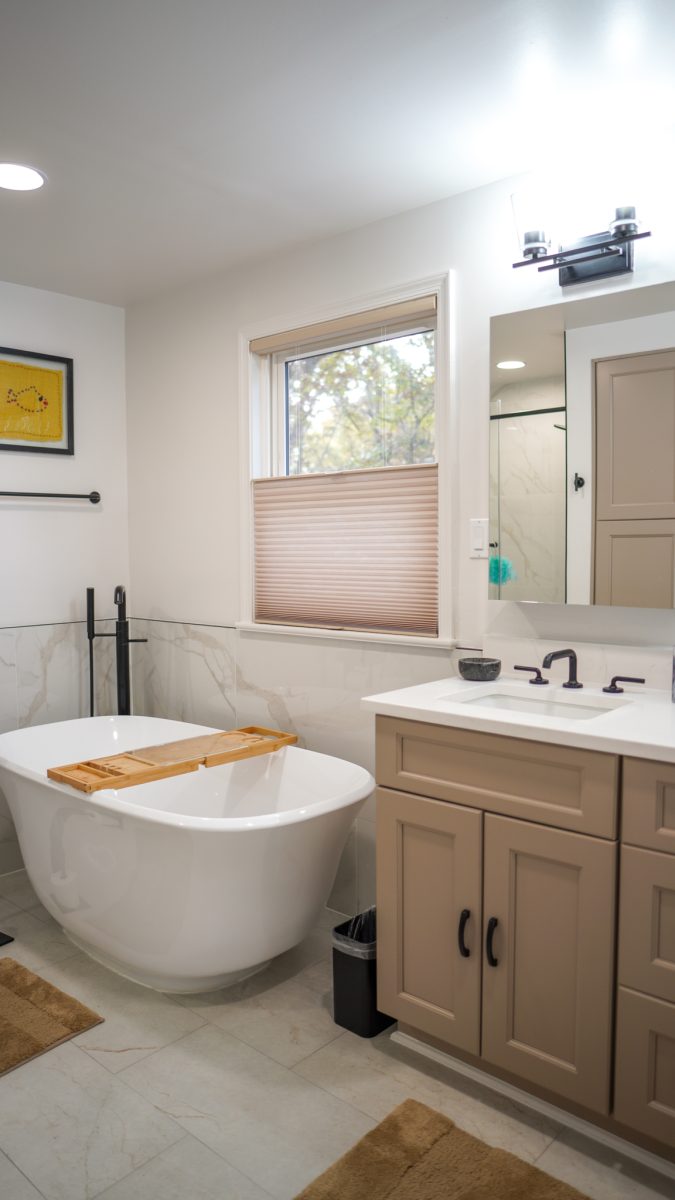 Choosing the right window treatments is crucial in a bathroom, where privacy and natural light must be carefully managed. We incorporated Hunter Douglas shades from Nation’s Blinds, providing a stylish yet practical solution that complements the room’s overall design. The shades allow for adjustable lighting, helping to create a serene, spa-like atmosphere at any time of day.