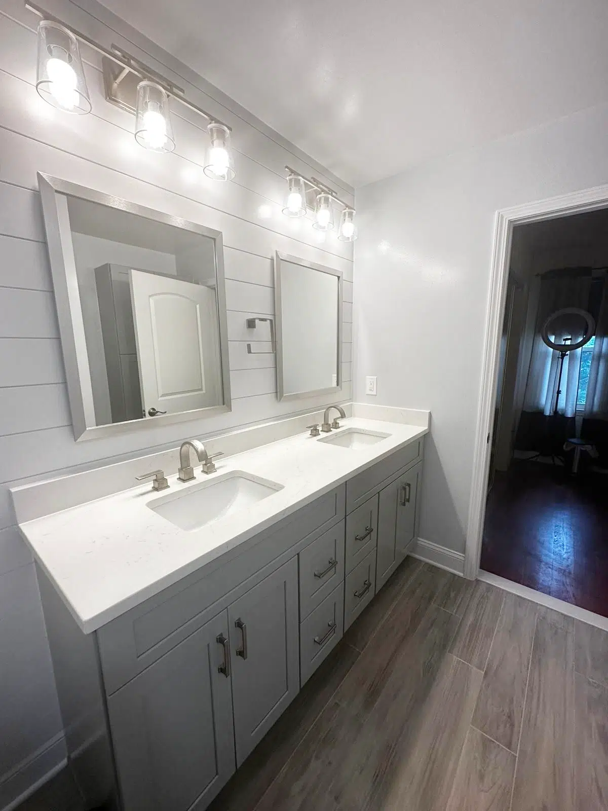 Experience the epitome of bathroom transformations in Fairfax, VA. Our expert team seamlessly removed walls, merging bedroom and bathroom spaces to craft a spacious oasis. Witness the elegance of an extended master bath boasting a double vanity with charming shiplap paneling, while the shower’s expanded size promises a luxurious experience.
