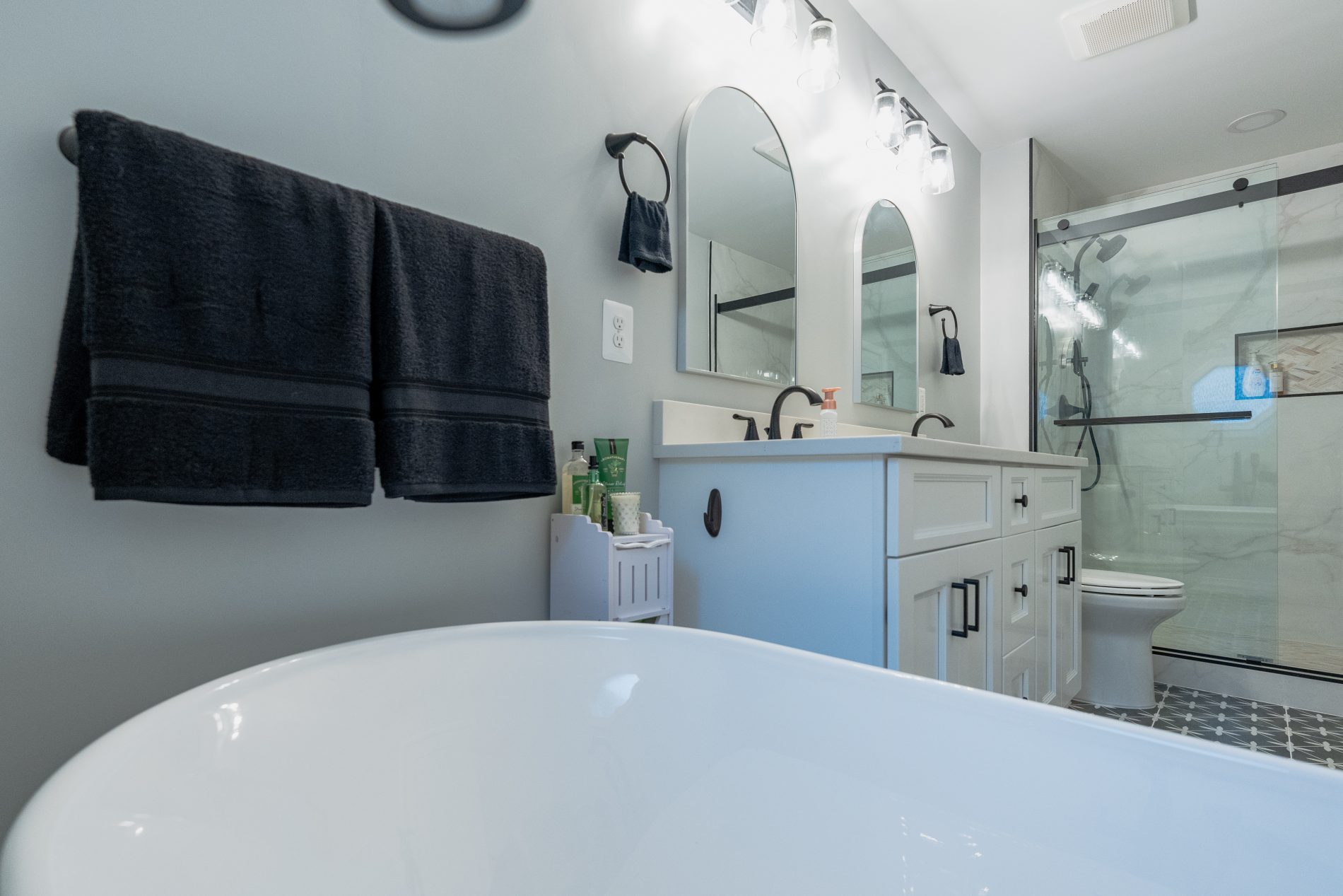 At My Kitchen and Bath, we specialize in transforming bathrooms with high-quality materials and expert craftsmanship. This Leesburg, VA bathroom remodel was a quick yet impactful upgrade, combining modern elegance with timeless design. The renovation featured a white shaker double vanity, a sleek walk-in shower with a sliding glass door, a freestanding bathtub, and designer series tiles, all complemented by matte black fixtures for a contemporary finish.