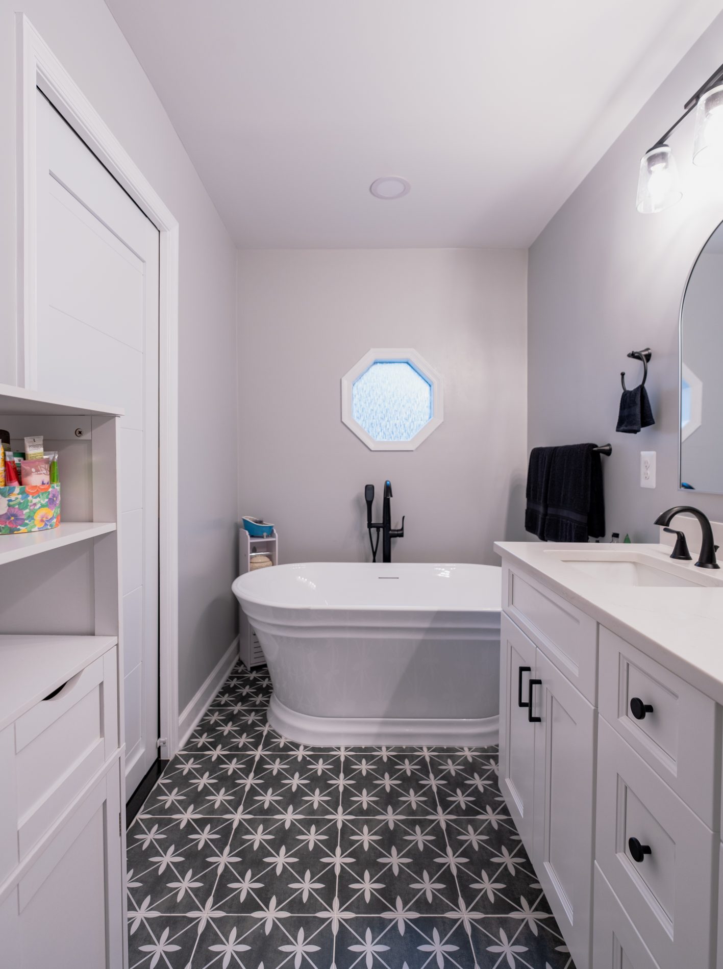 This Leesburg, VA bathroom remodel was completed efficiently without compromising quality. By integrating classic elements like the white shaker vanity with modern features such as matte black fixtures and a sliding glass shower door, the space now offers both style and convenience. The addition of a freestanding bathtub further enhances the luxurious feel, making this a perfect blend of functionality and elegance.