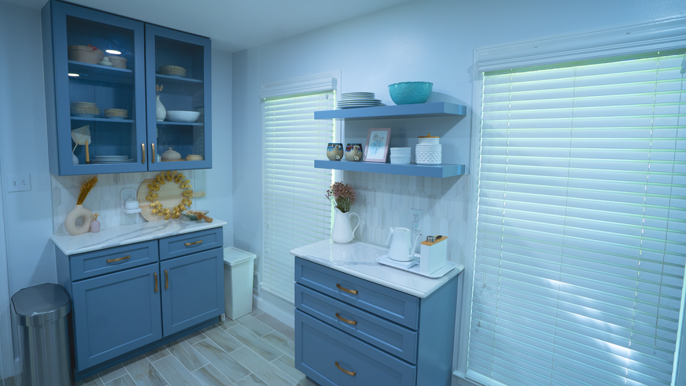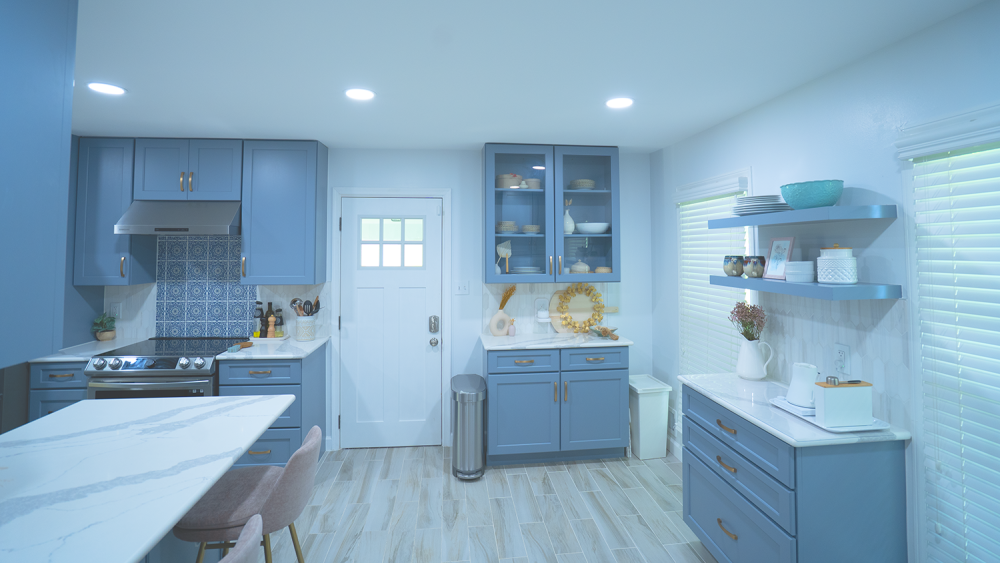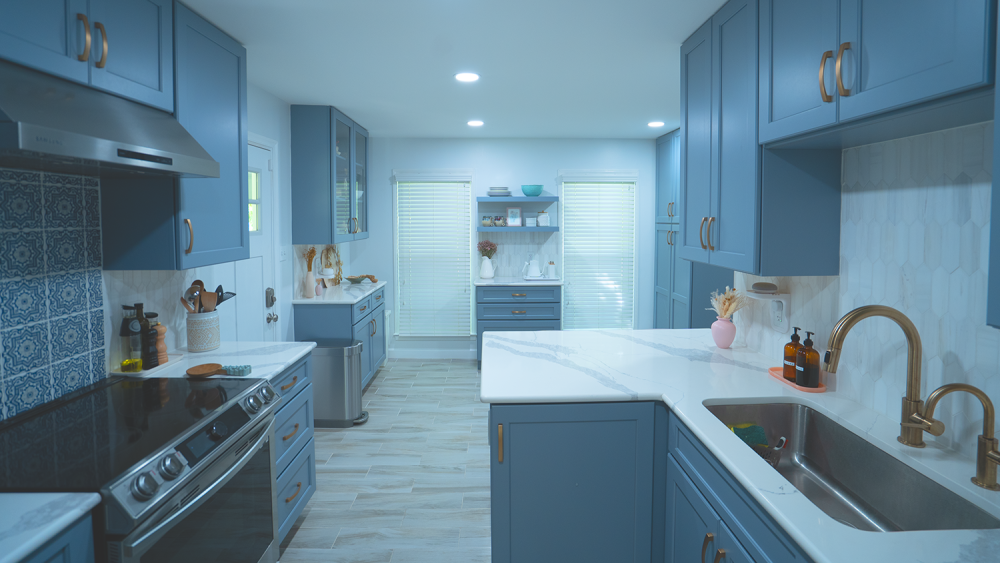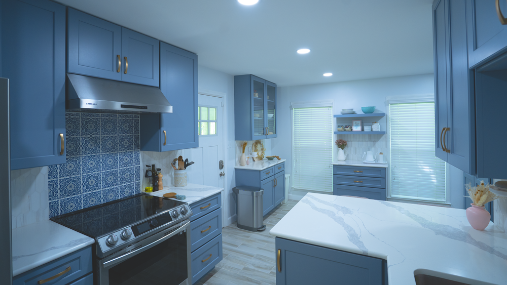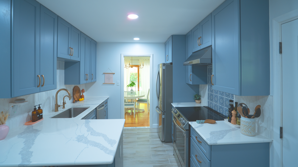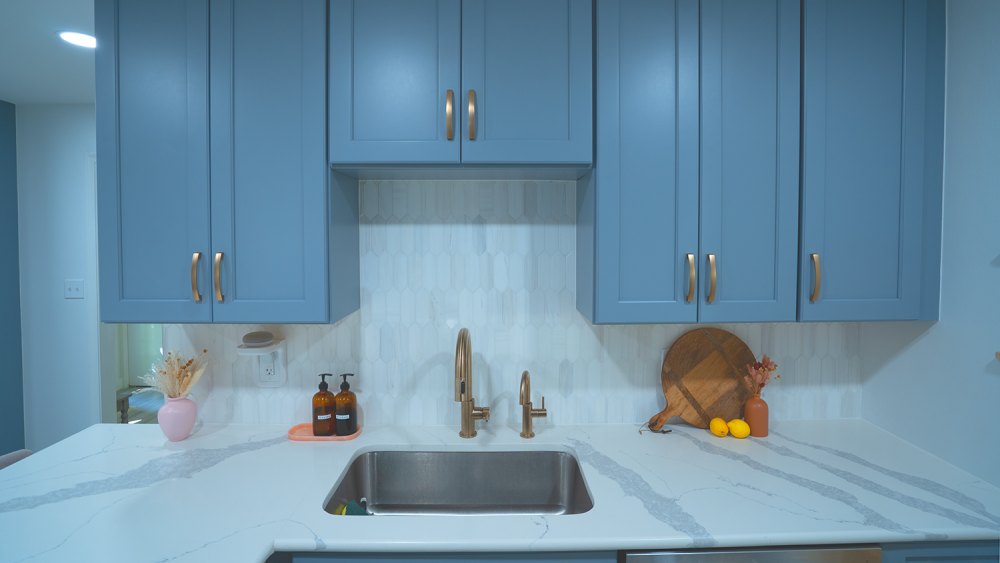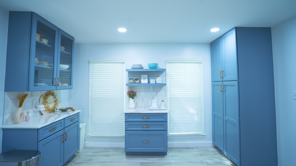 We installed Medallion Gold Line semi-custom cabinetry in the Dana Pointe door style with a stunning Dusk blue finish. These 100% U.S.-made maple cabinets feature solid wood frames, all-plywood construction, and soft-close doors and drawers — backed by a limited lifetime warranty. The new layout improved both aesthetics and functionality.