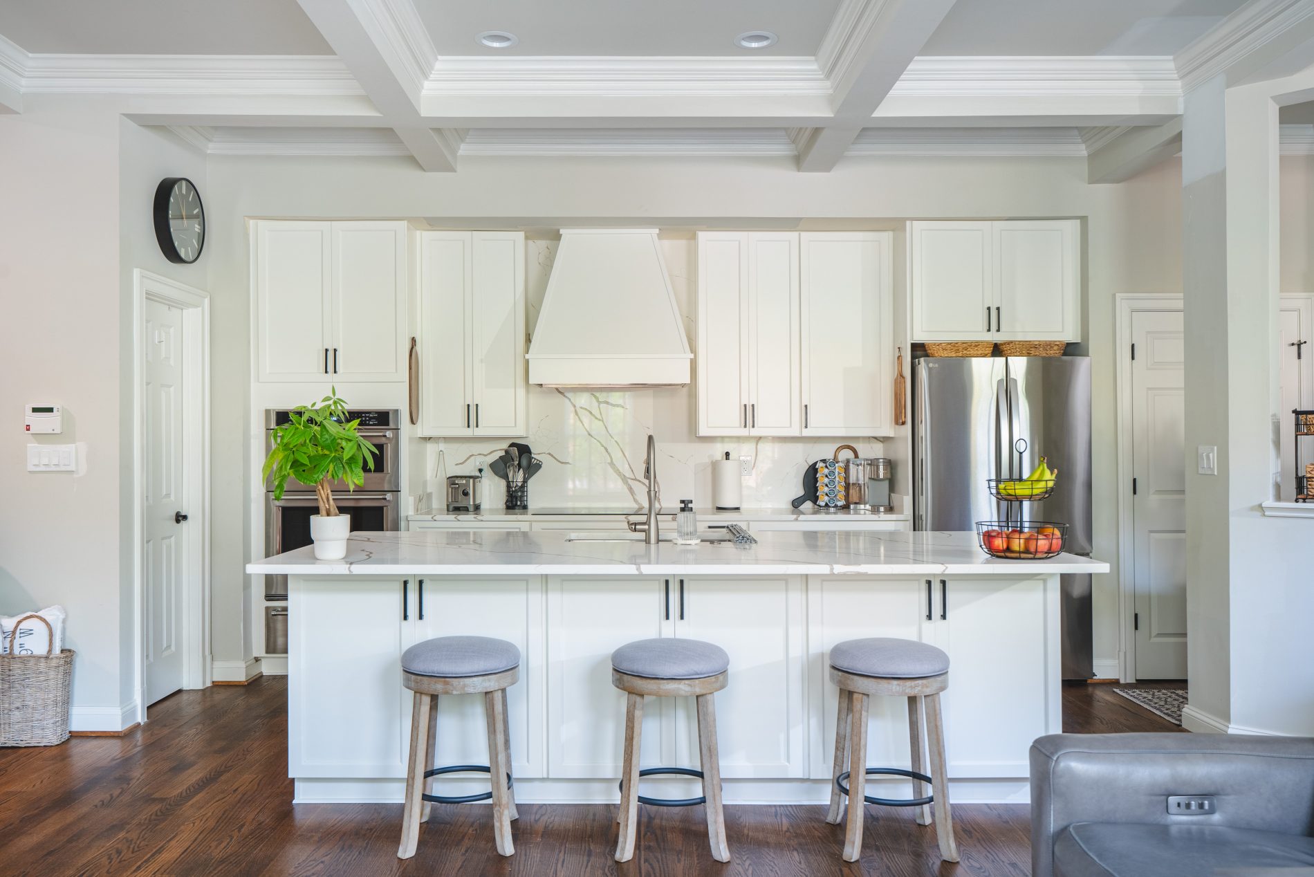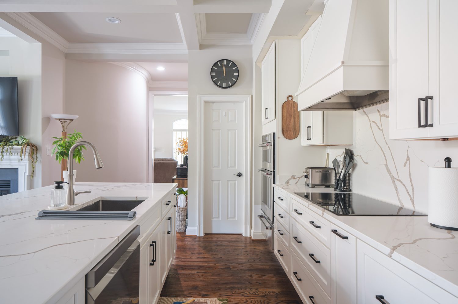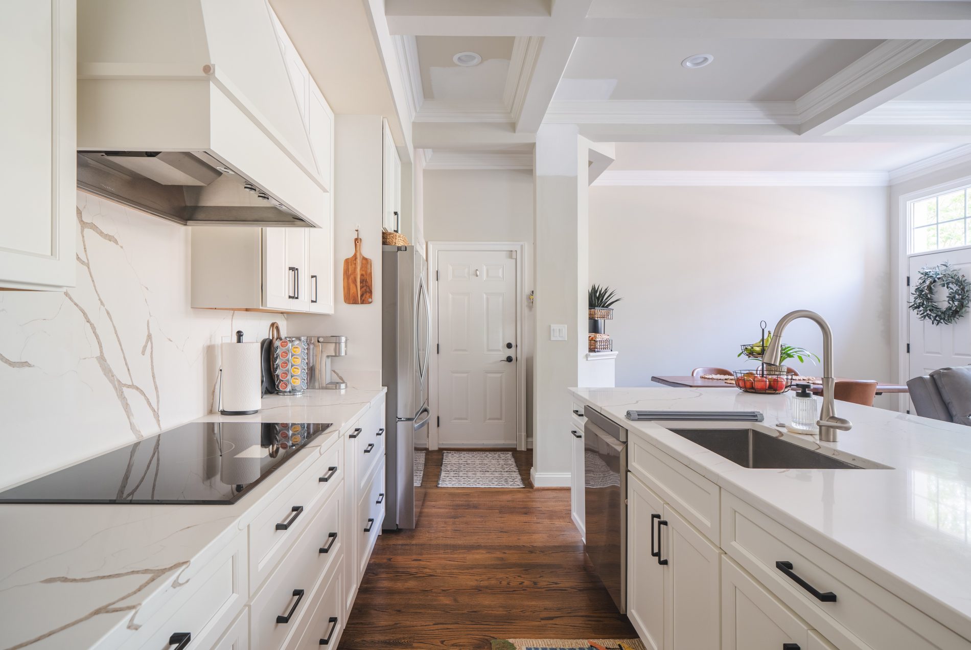This Fairfax kitchen now feels brighter, more open, and thoughtfully designed for everyday living. The combination of white cabinetry, smooth quartz, and subtle matte black hardware creates a timeless look that works for both busy mornings and weekend entertaining.