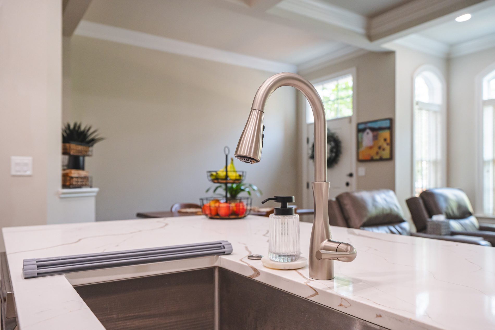This seamless stone installation gives the kitchen a polished, high-end look.