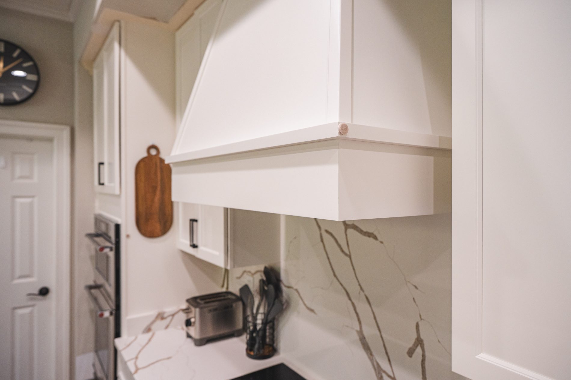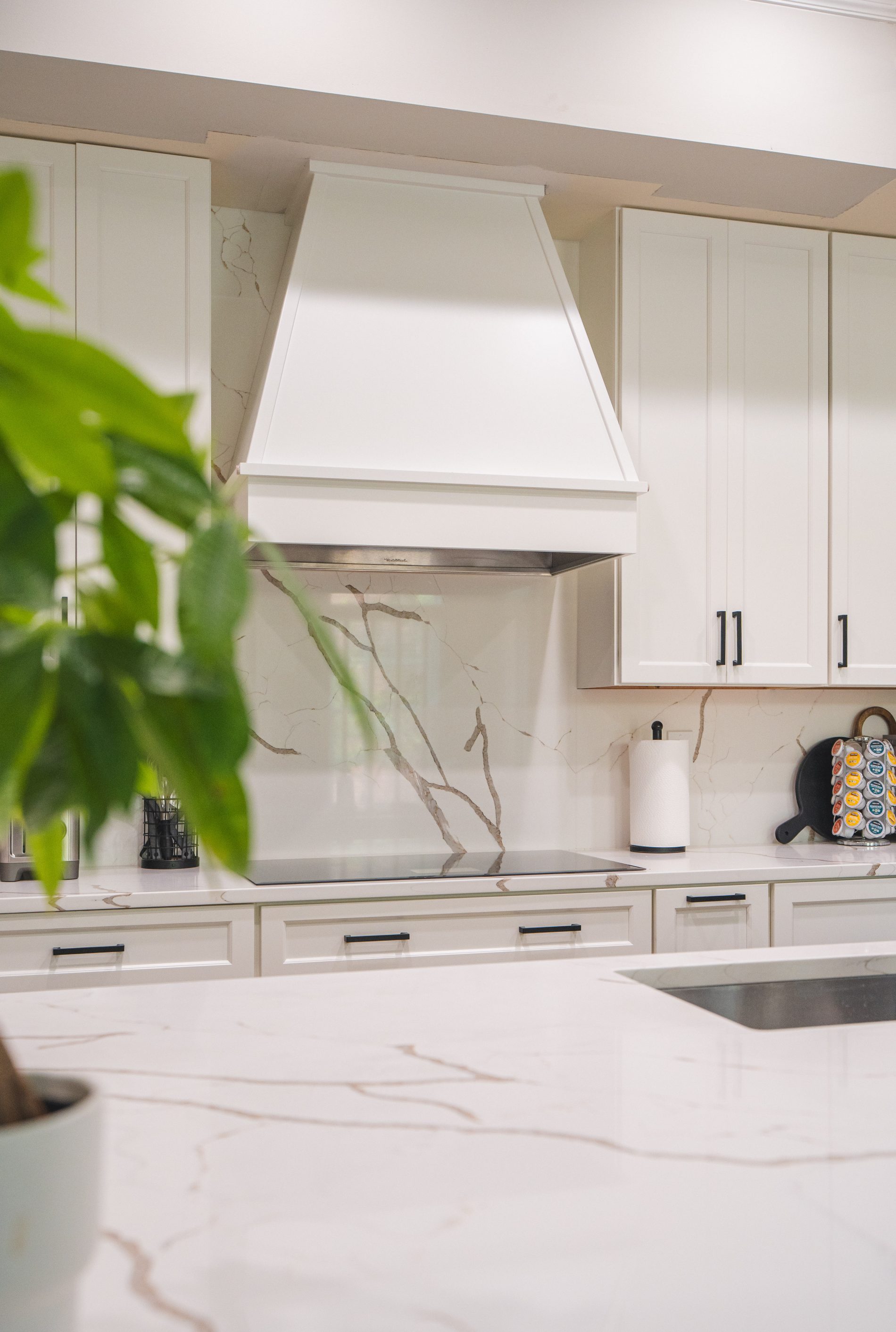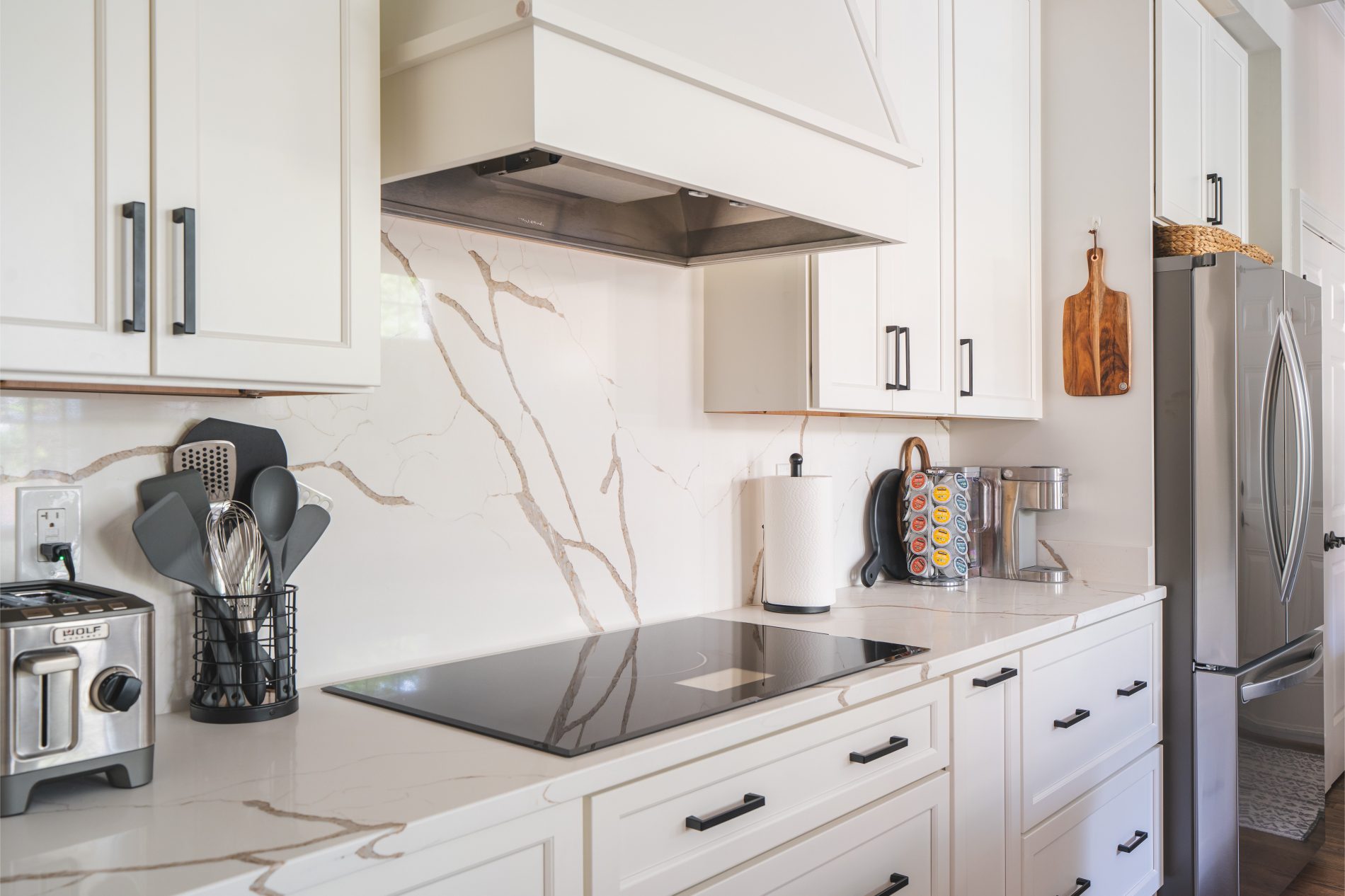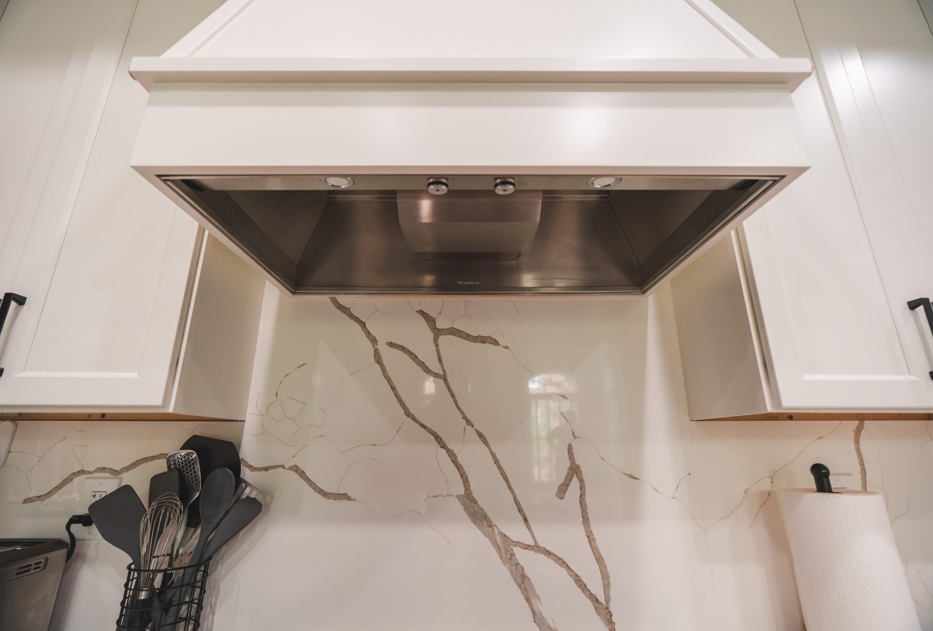 A full-height backsplash behind the new range hood