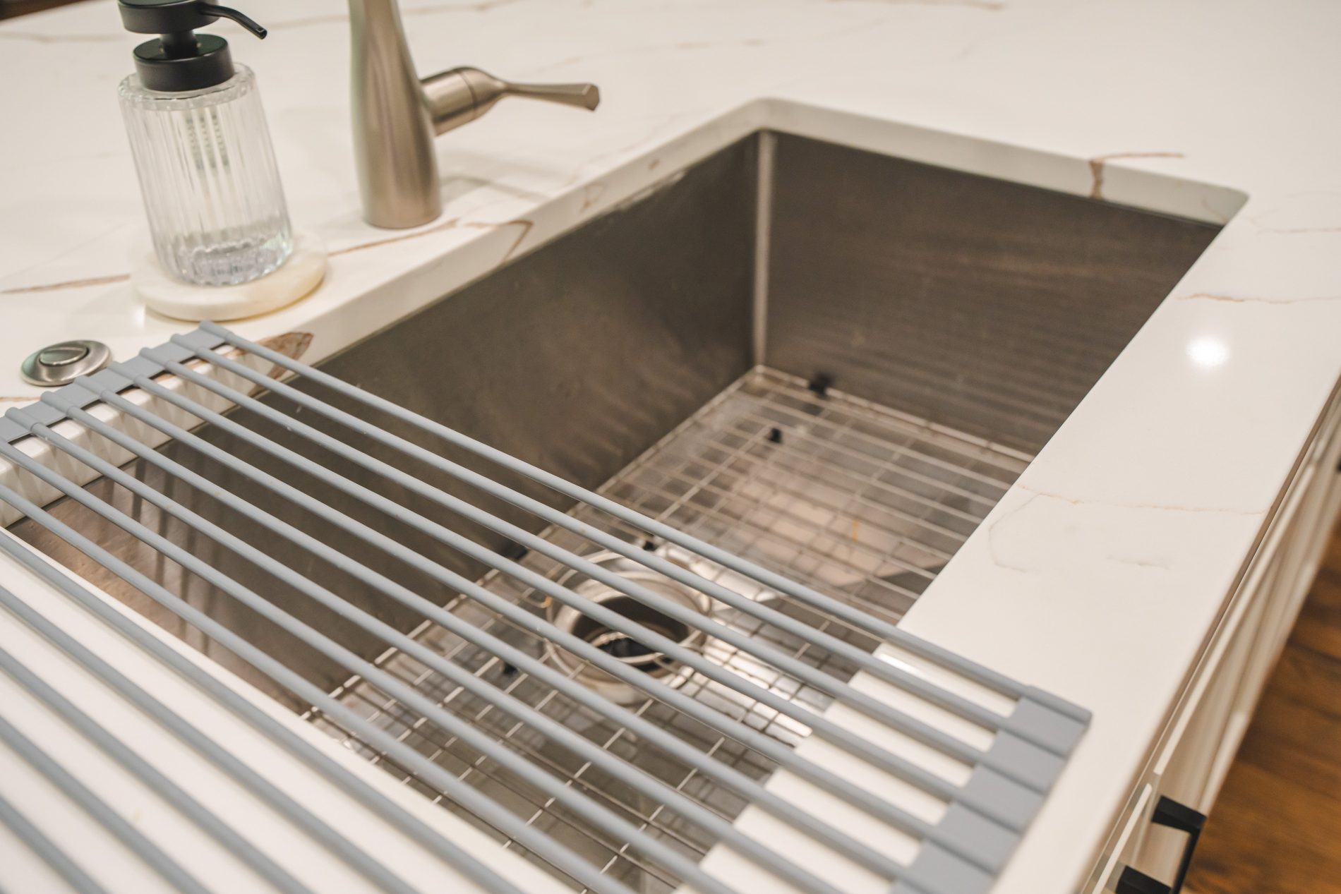 We ran a new water line for the relocated refrigerator and installed a new InSinkErator Badger 5 garbage disposal with SoundSeal technology. All plumbing for the sink, dishwasher, and disposal was reconnected as part of the update.