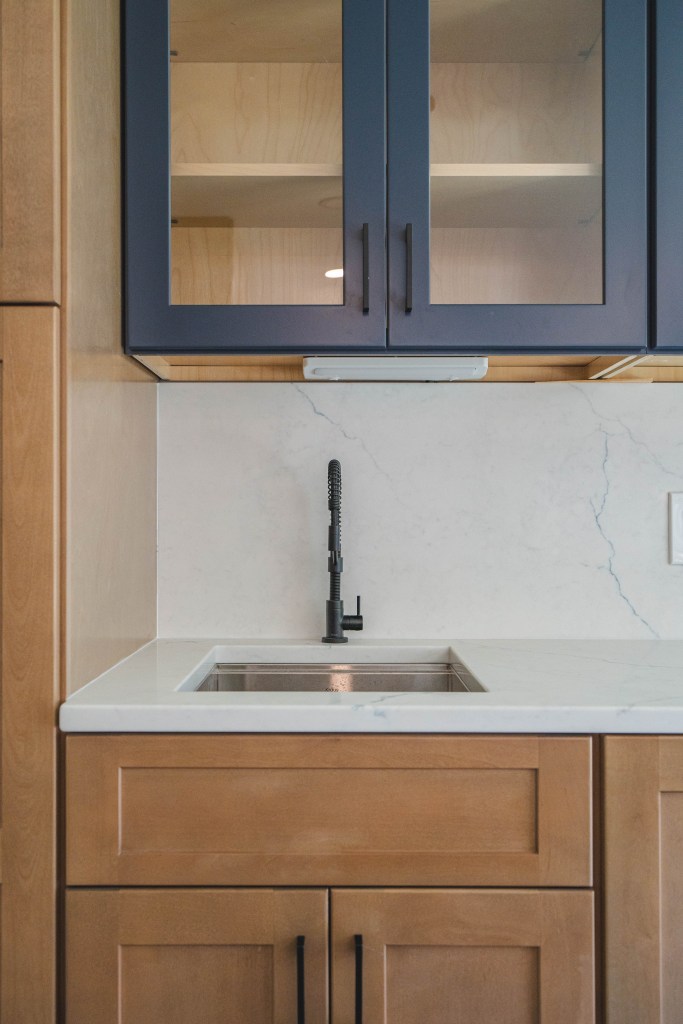 The kitchen’s two-tone color scheme combines deep blue cabinetry with rich wood textures, bringing warmth and contrast to the space. This color pairing complements the open layout while adding depth and personality, making the room feel modern and inviting. The natural wood tones enhance the blue’s boldness, creating a balanced yet visually striking design.