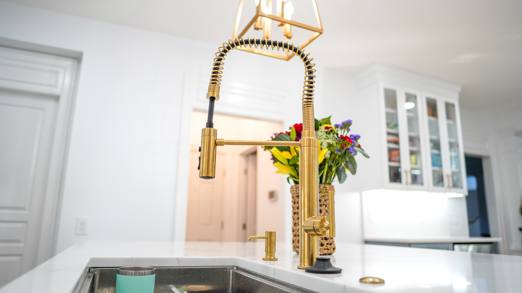Every detail in this kitchen was chosen with care. The Kohler gold finish kitchen faucet and Delta Lorei sink not only add functionality but also bring warmth and a touch of luxury. These fixtures match the gold brass cabinet handles, pulling the entire design together.