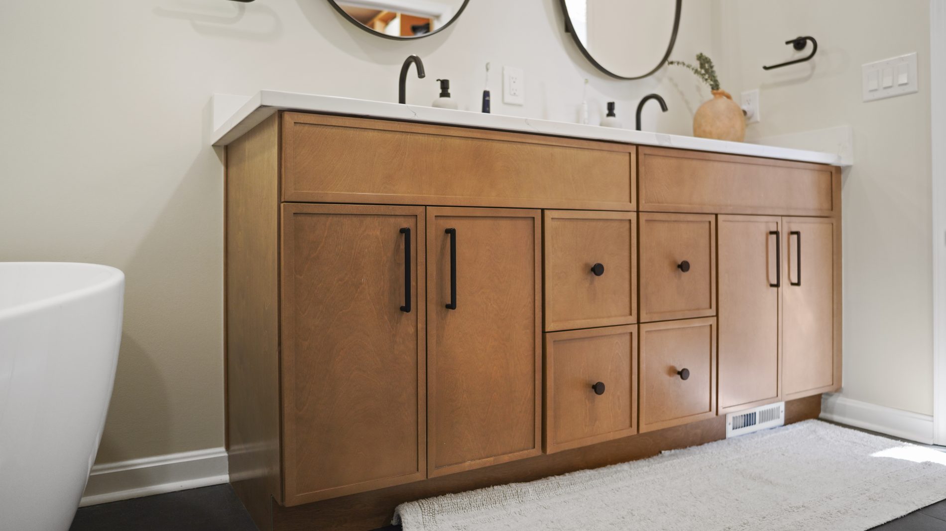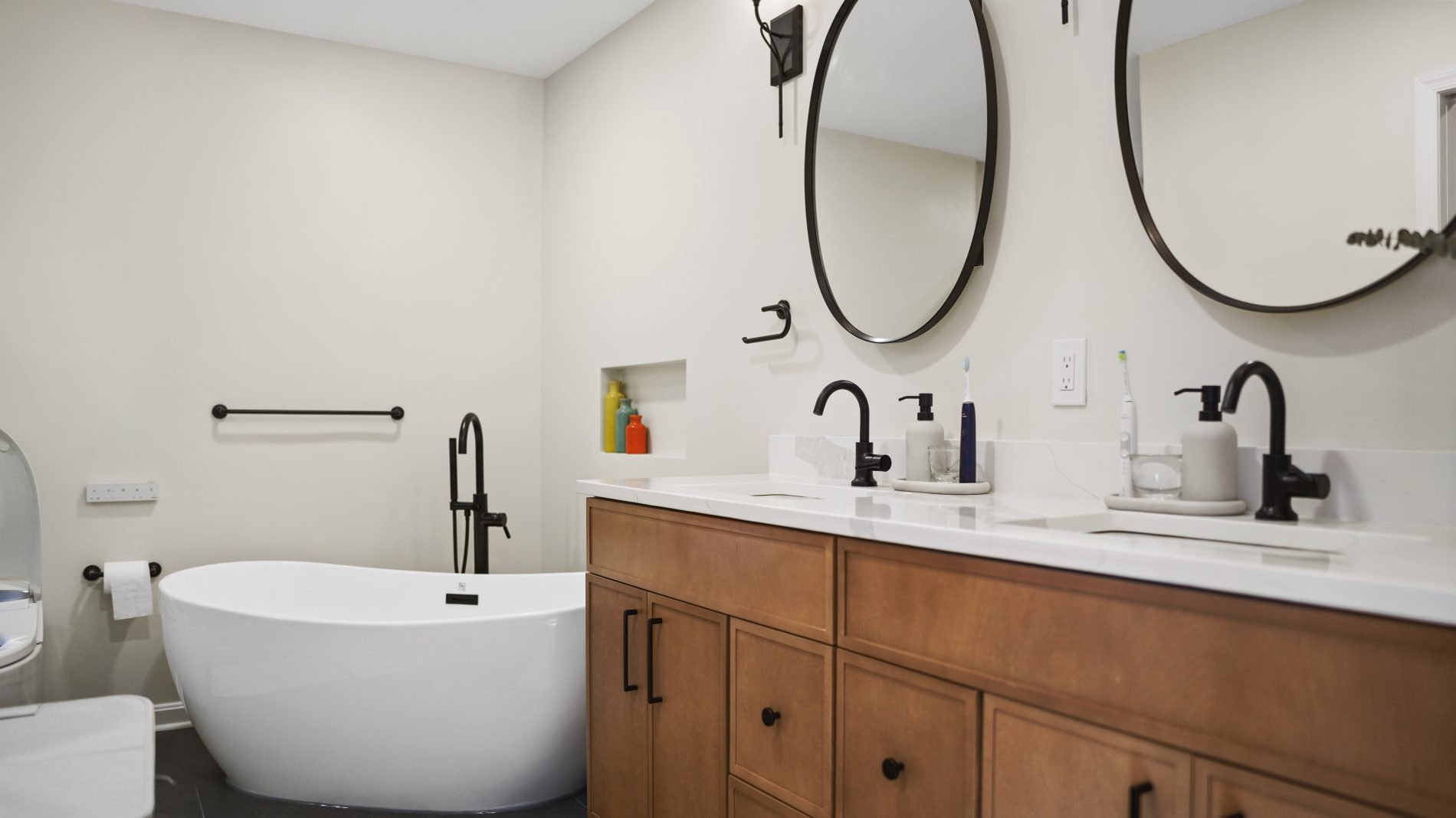 By incorporating a freestanding bathtub, a spacious walk-in shower, and a double vanity, this remodel completely transformed the bathroom into a high-end, spa-like retreat. The combination of neutral tones, rich textures, and premium materials creates a soothing, elegant ambiance. Soft-close cabinetry, durable quartz countertops, and stylish black hardware add the perfect finishing touches to this space.