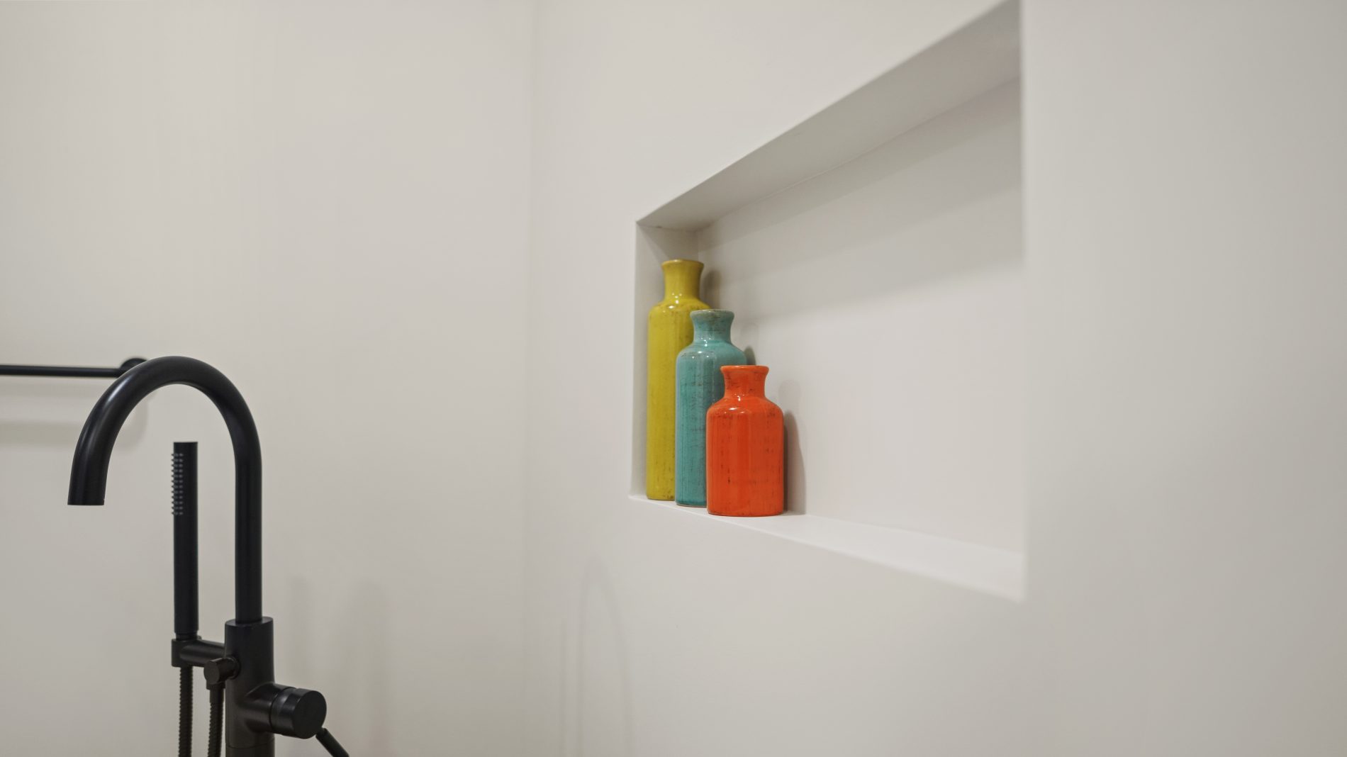 Porcelain tile from floor to ceiling, installed with cement board and RedGard waterproofing