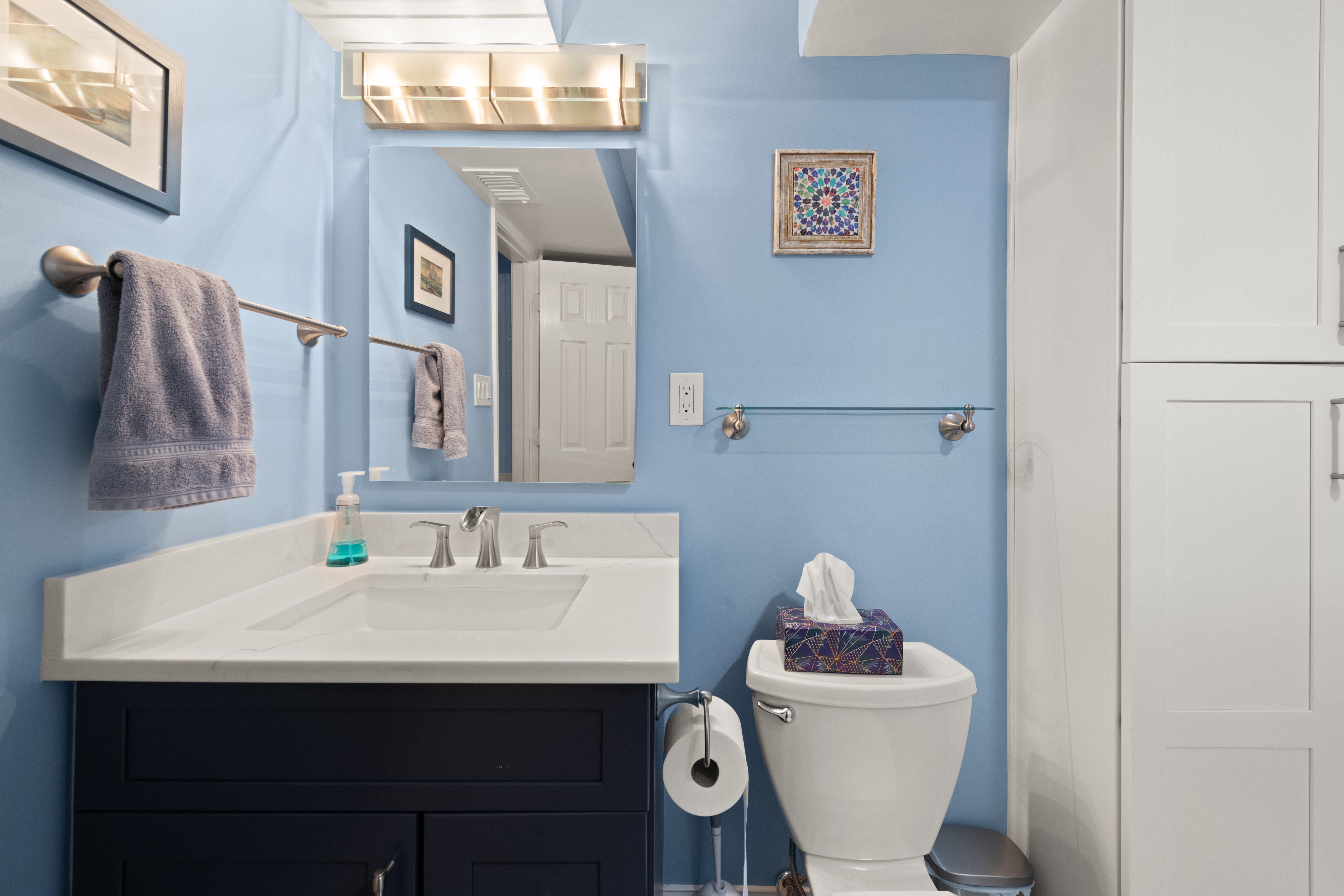 The focal point of this small bathroom in Arlington, VA is the 30″ Fabuwood Allure Galaxy Indigo vanity, paired with a Galaxy Frost white linen closet. The deep indigo finish adds richness and contrast, while the white cabinetry keeps the space feeling light and fresh.
