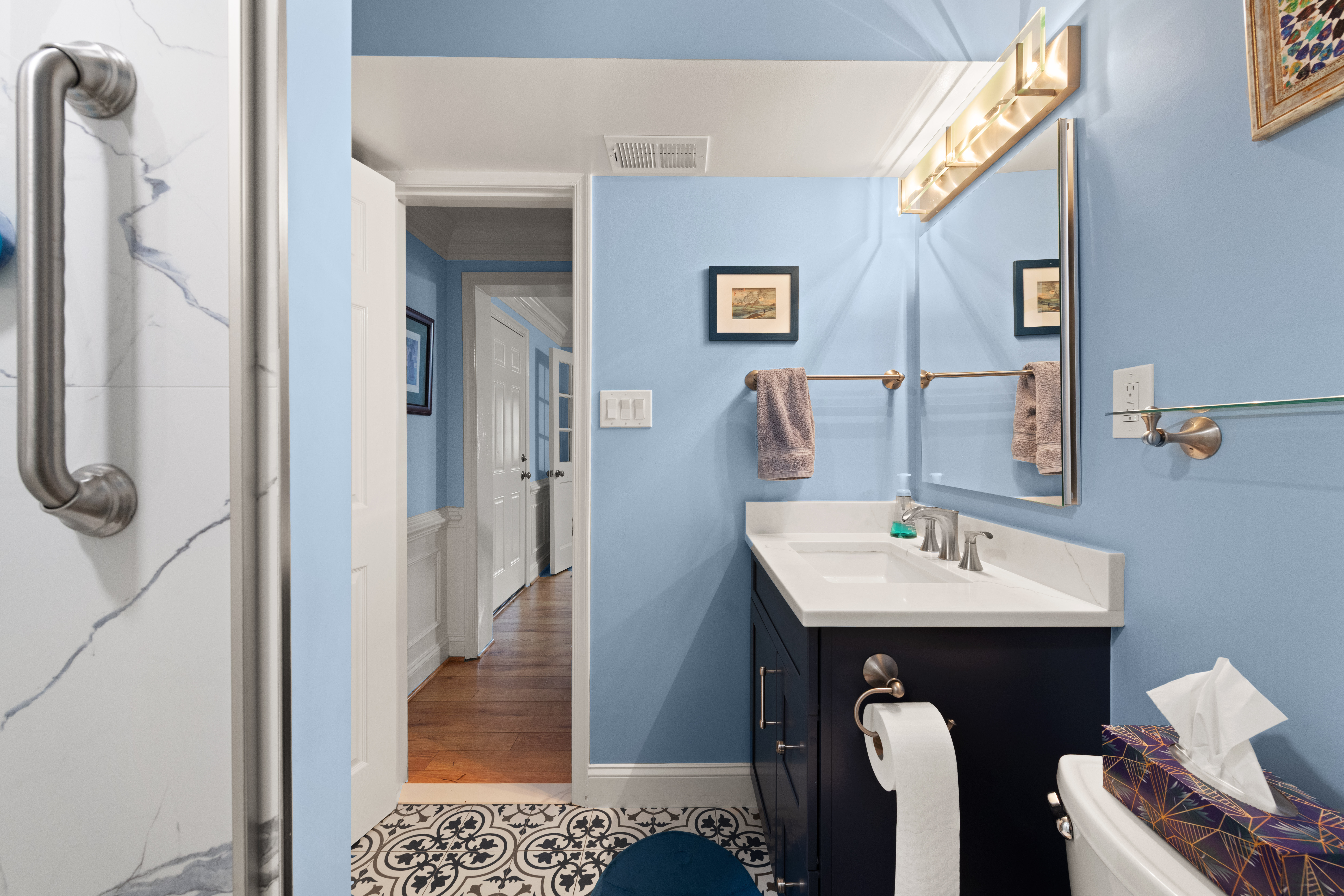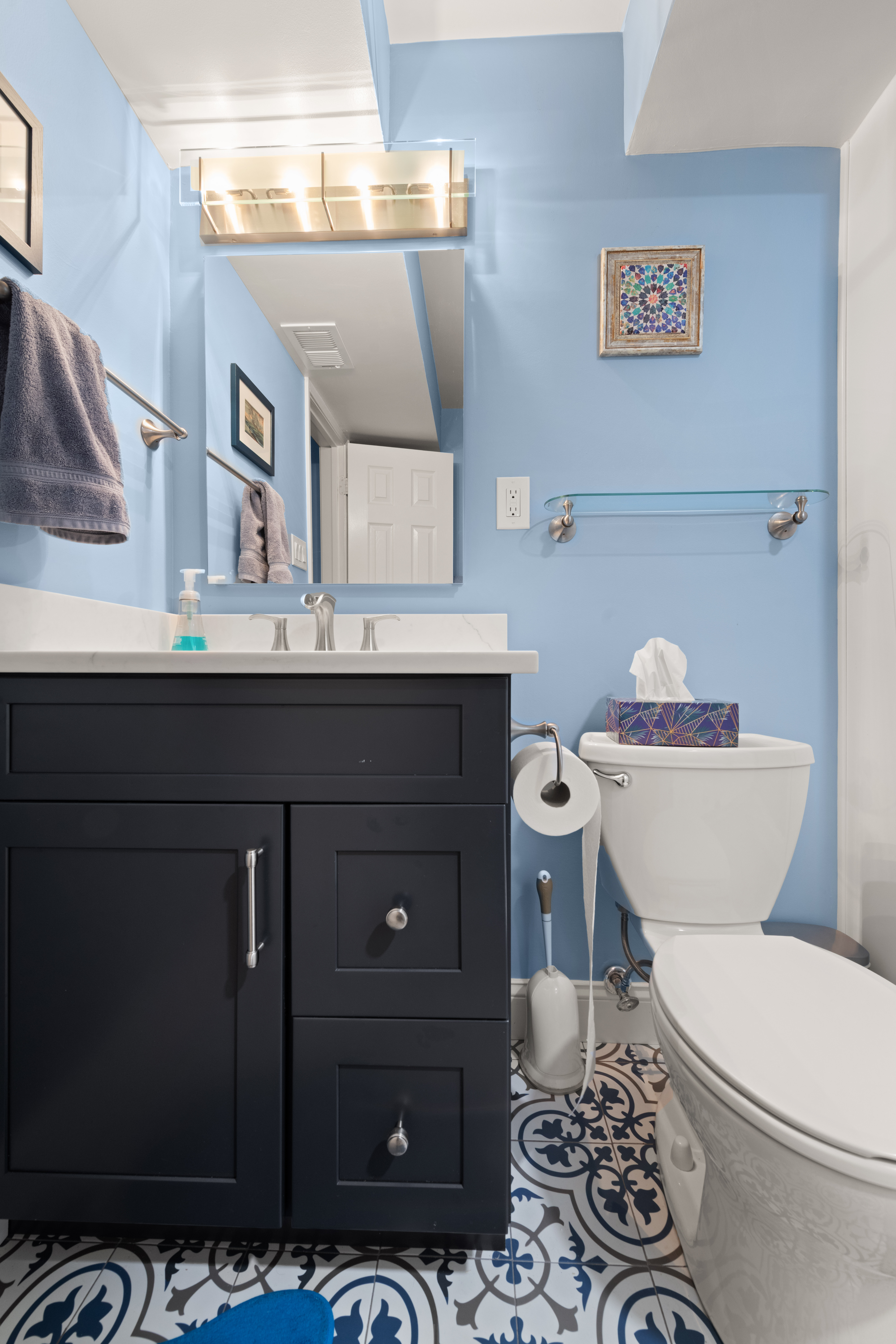 The patterned floor anchors the space and balances the bold vanity beautifully.