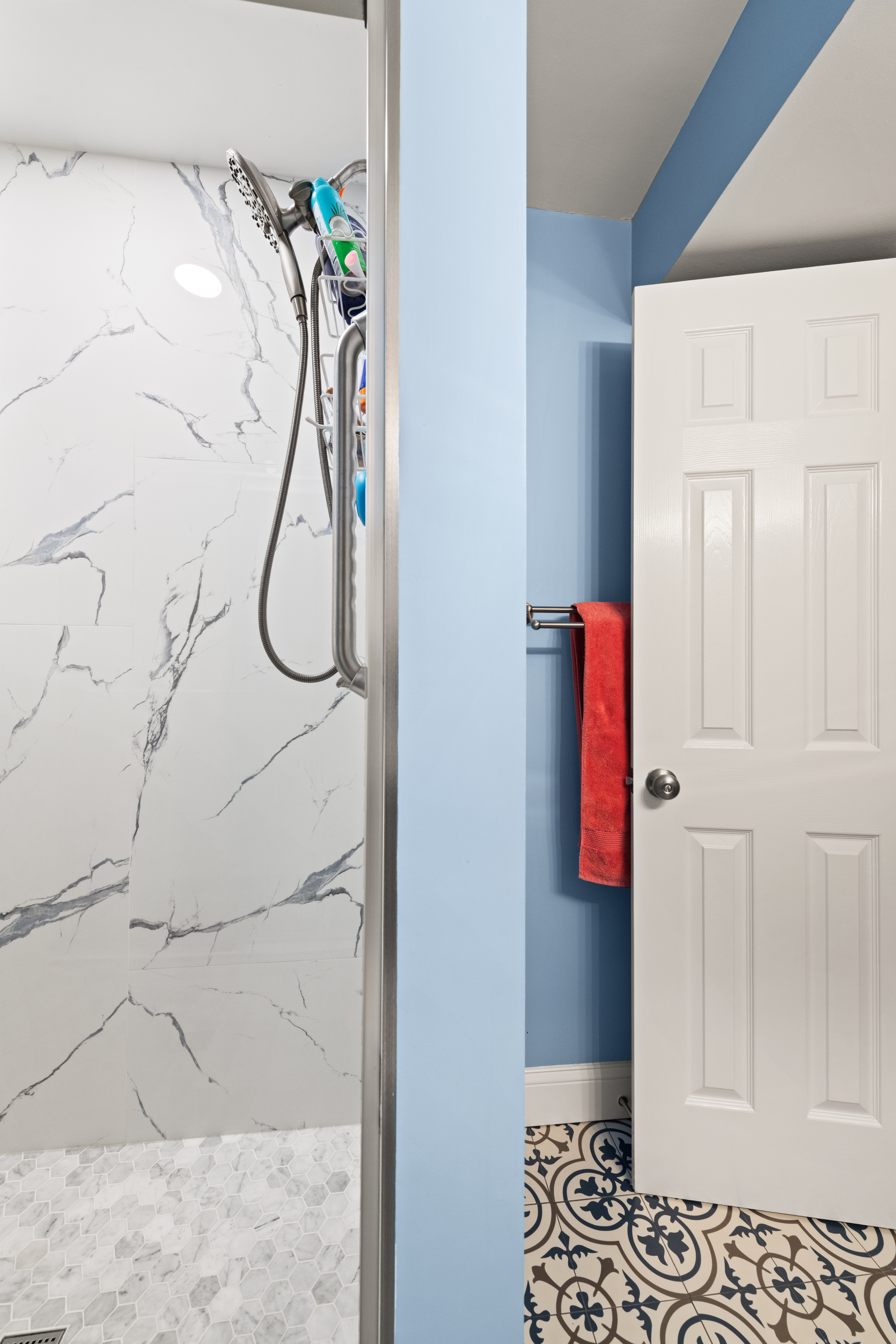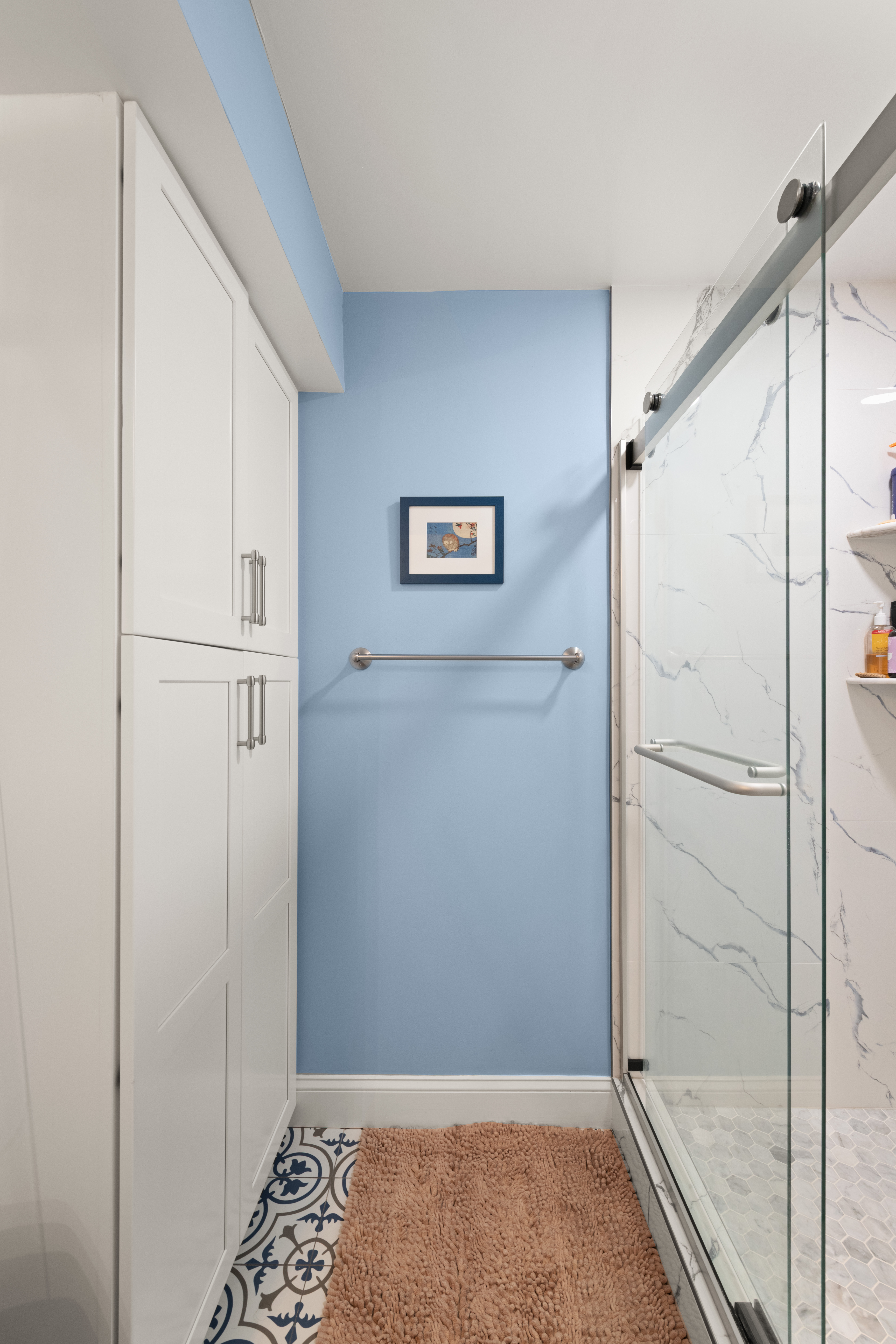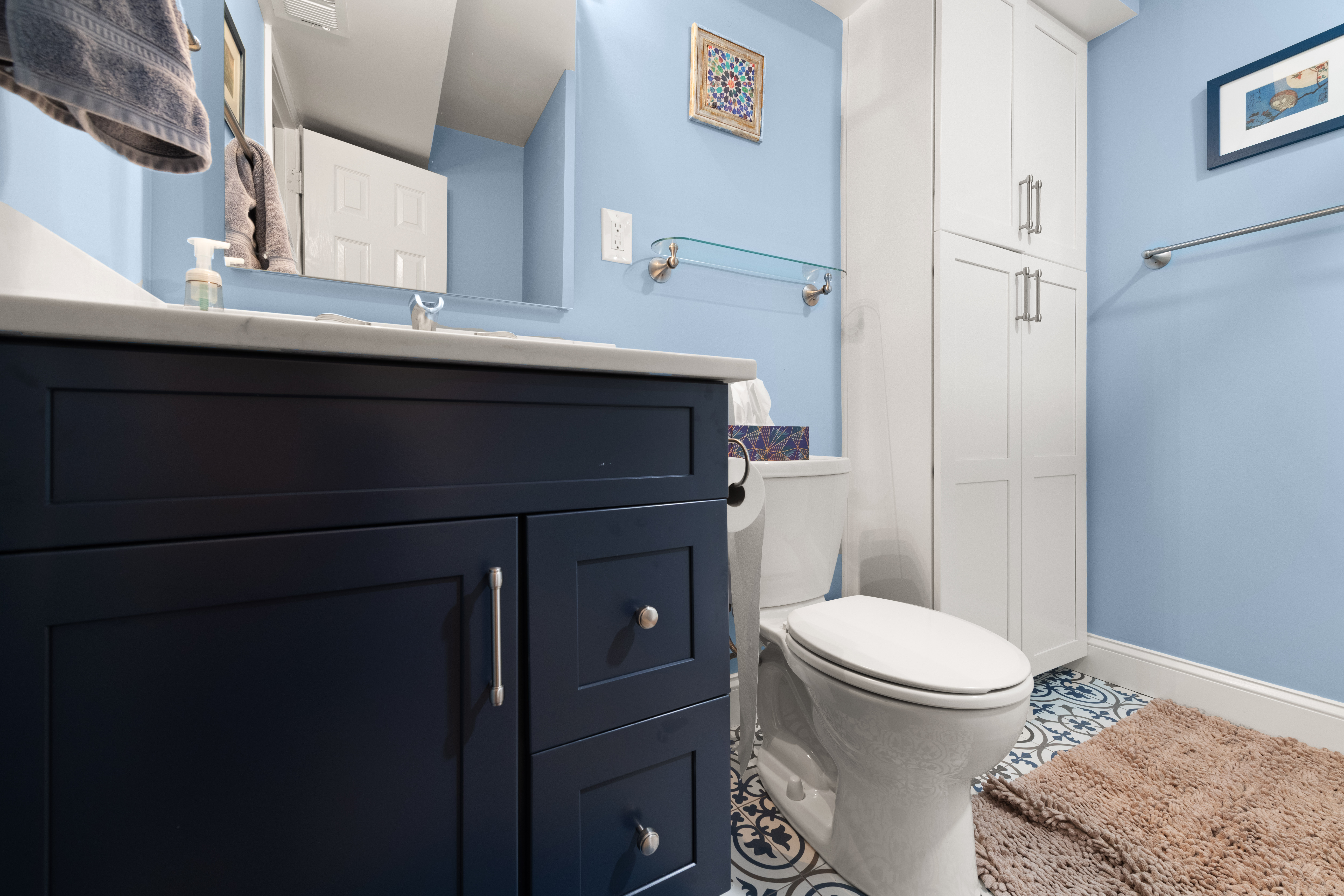 This small bathroom remodel in Arlington, VA now feels bright, modern, and thoughtfully designed. With bold cabinetry, patterned flooring, floor-to-ceiling shower tile, and smart storage solutions, the space proves that even a compact bathroom can deliver both style and functionality.